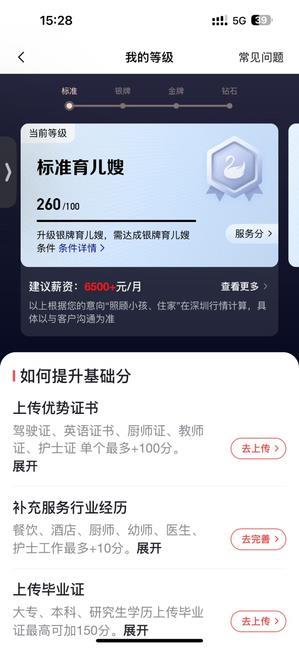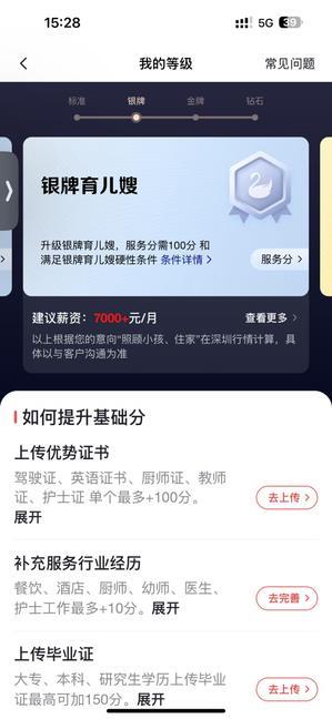 更让她不安的是,“钟老师”不断推销附加课程,如辅食制作、小儿推拿等,还需另外支付1600元培训费用。当小黄表示无力承担时,对方建议她使用花呗或信用卡支付,并承诺支付后帮小黄升级为银牌育儿嫂,平台信息显示,她目前等级为“标准育儿嫂”,建议薪资6500+元/月。升级后底薪可涨至7000+元/月。